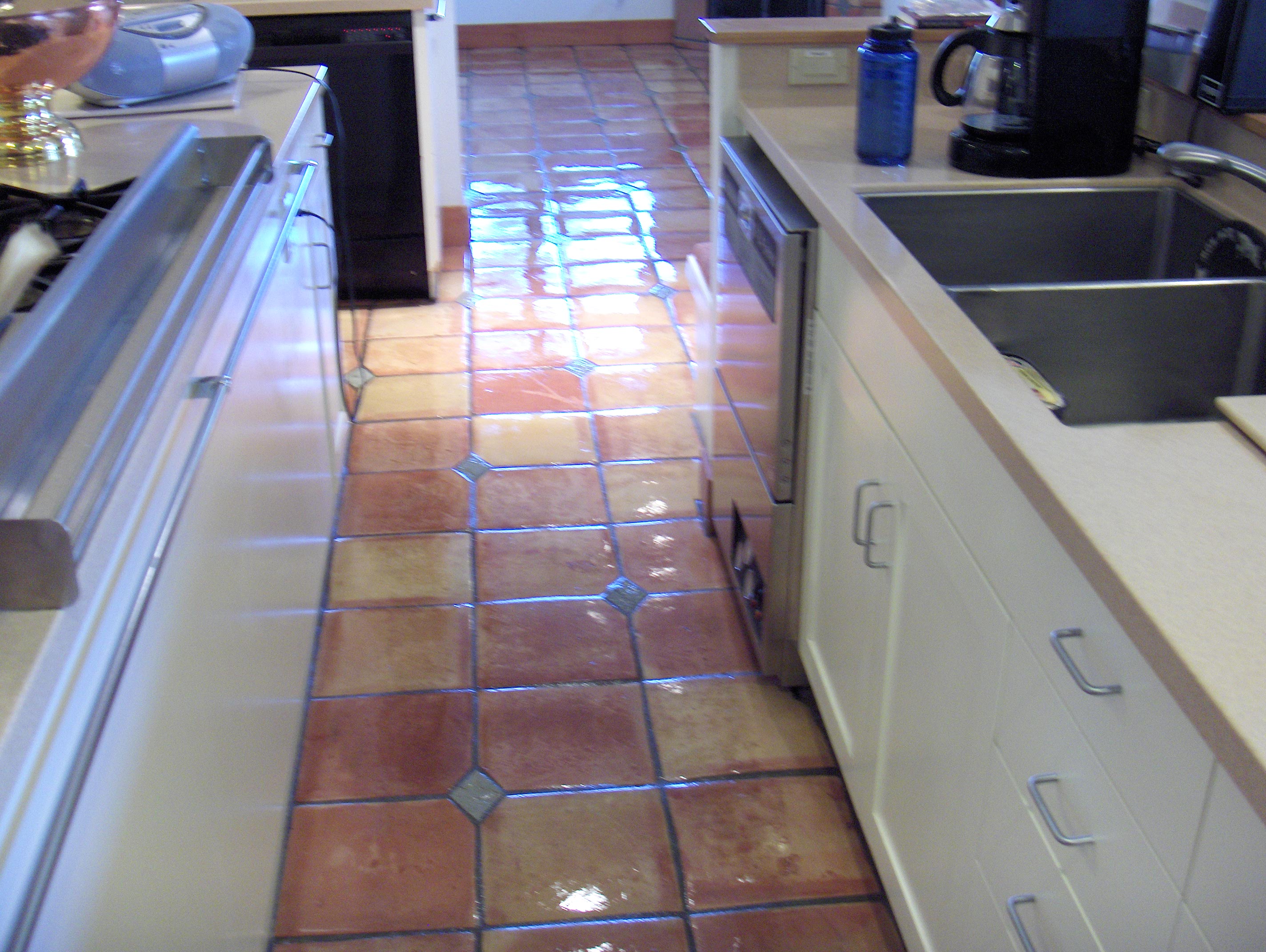 Saltillo Tile cleaned & sealed. Never "Steam Clean" Mexican tile floors or use vinegar (Acetic acid) it will ruin the finish. We do not use solvent based and dangerous products.